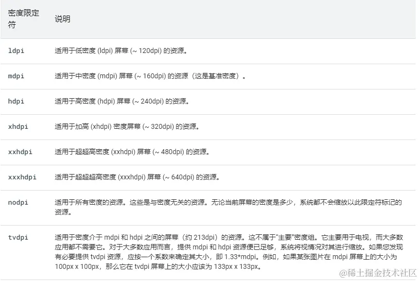 不同屏幕像素密度的设备就对应了不同的配置限定符。例如,在 320 到 480 dpi 之间的设备就对应 xxhdpi,该类型设备在取图片时就会优先从 drawable-xxhdpi 文件夹下取