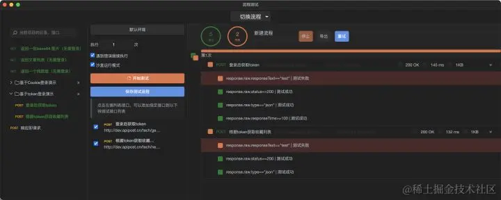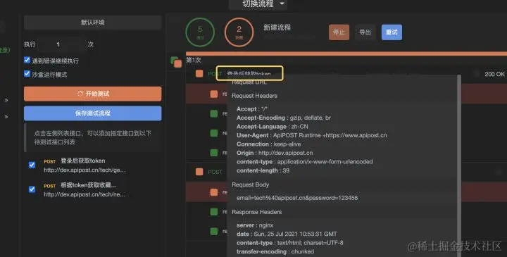 流程测试是针对一个接口集合的测试,选择相应的环境,可以作为一系列请求一起运行。