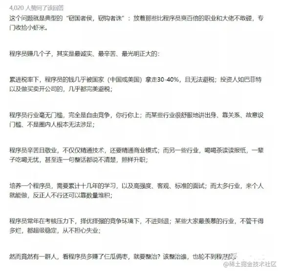 而且,做人真的别太双标,别只看人吃肉,不看人挨揍。程序员赚得多,但工作压力也是全国皆知,说不好听的,赚的都是卖命钱。