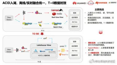2015 年之后,对数据系统进行整合合并,包括通过 GaussDB 替代 Teradata 数仓,形成了融合数仓,在工行被称之为一湖两库,以 FusionInsight 构建数据湖底座以支持全量的数据加工,同时实时分析、交互式分析等业务也在其中得以开展。