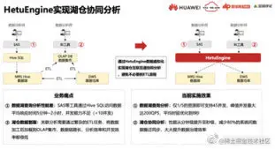 通过 HetuEngine 数据虚拟化实现湖仓协同分析,一方面替代 Hive SQL 访问 Hive 的数据,只需 1/5 的资源即可支撑大概原来 5 倍并发,同时访问时延降到秒级。另一方面可同时访问 Hive 和 DWS 提供秒级的关联查询,可以减少 80%的系统间的数据搬迁,大量的减少 ETL 的过程。