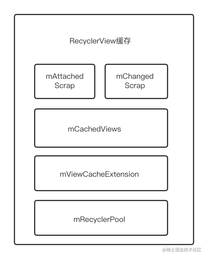 相信大部分的Android开发者对RecyclerView的缓存机制如数家珍。相关教程也是数不胜数。如果你想详细了解这些不同缓存的作用以及实现原理。可以参考我之前写过的两篇文章。聊聊RecyclerView缓存机制和详细聊聊RecyclerView缓存机制,前者主要是介绍各个层级缓存的作用以及它们之间的区别,后者主要是从源码的角度讲解缓存是怎么实现的。缓存架构图如下: