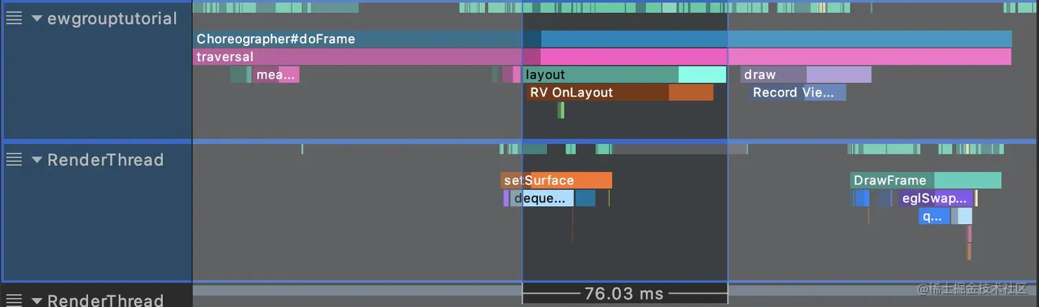 对比RV OnLayout事件,优化后的效果只需要76ms。将近10倍的优化空间。实际效果是,跳转Activity很顺滑很流畅。