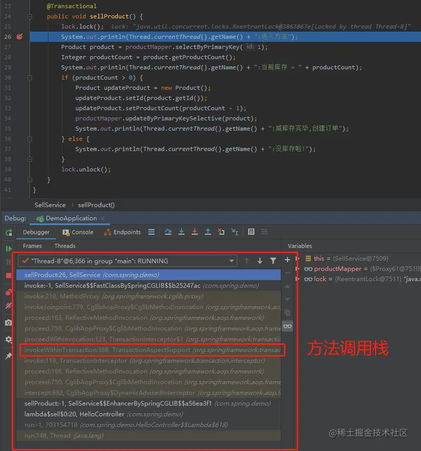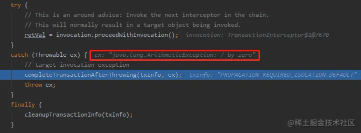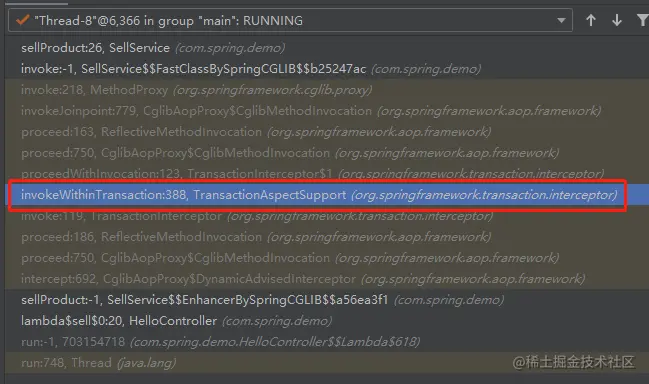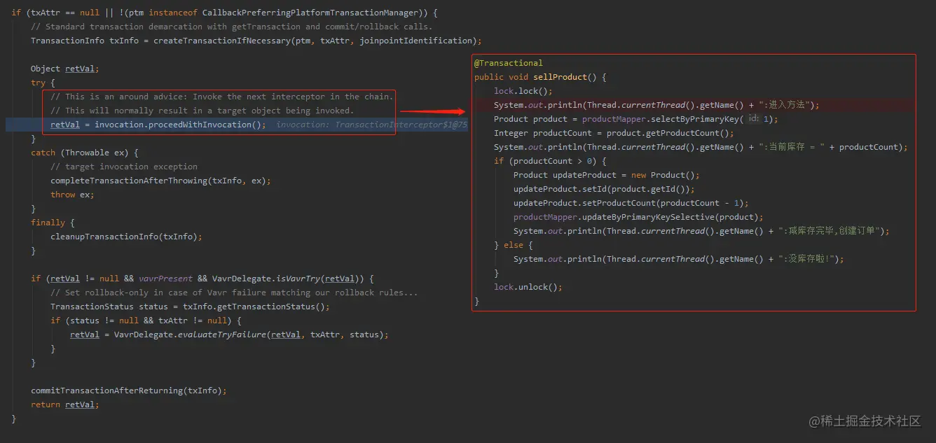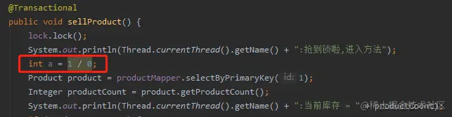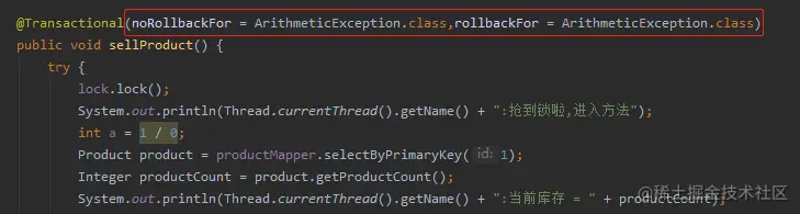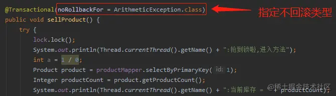 因为 sellProductBiz 抛出异常后,会调用 completeTransactionAfterThrowing 方法执行回滚逻辑。