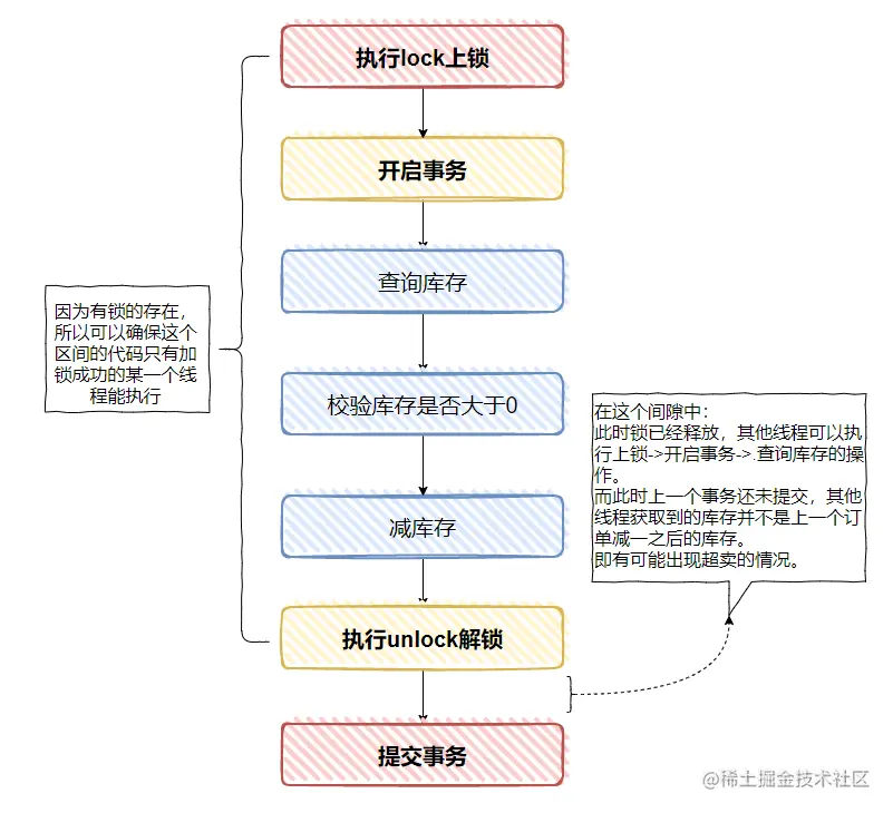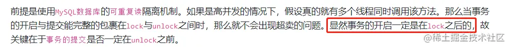 但是,如果事务的提交是在 unlock 之后,那么有意思的事情就出现了,你很有可能发生超卖的情况。