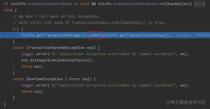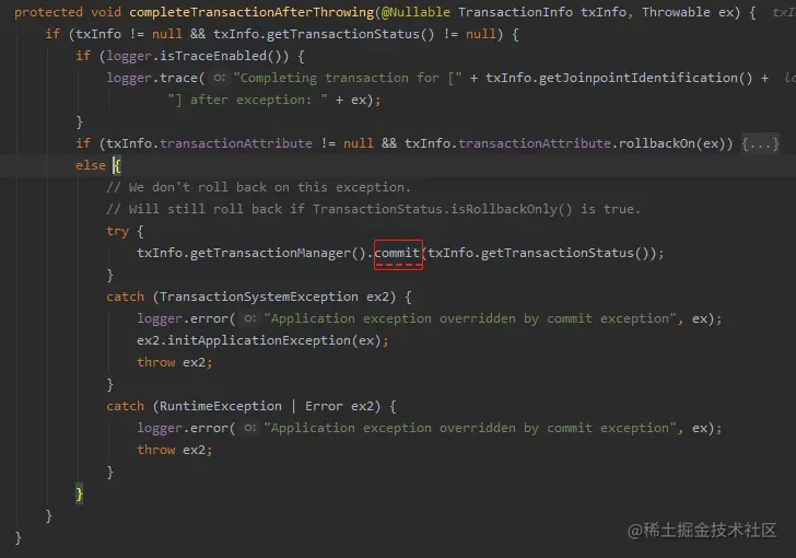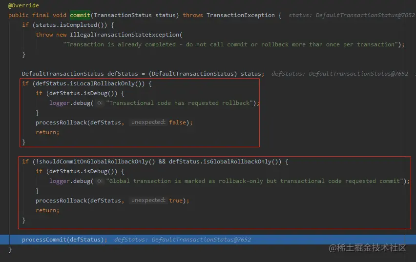 在 commit 之前还有两个判断,如果事务被标记为 rollback-only 了,还是得回滚。