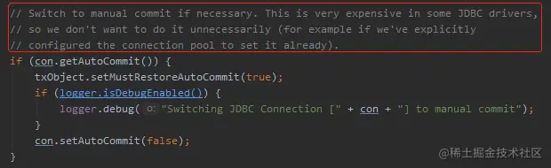 写这么长一段注释,意思就是给你说,这个参数我们默认是 ture,原因就是在某些 JDBC 的驱动中,切换为自动提交是一个很重的操作。