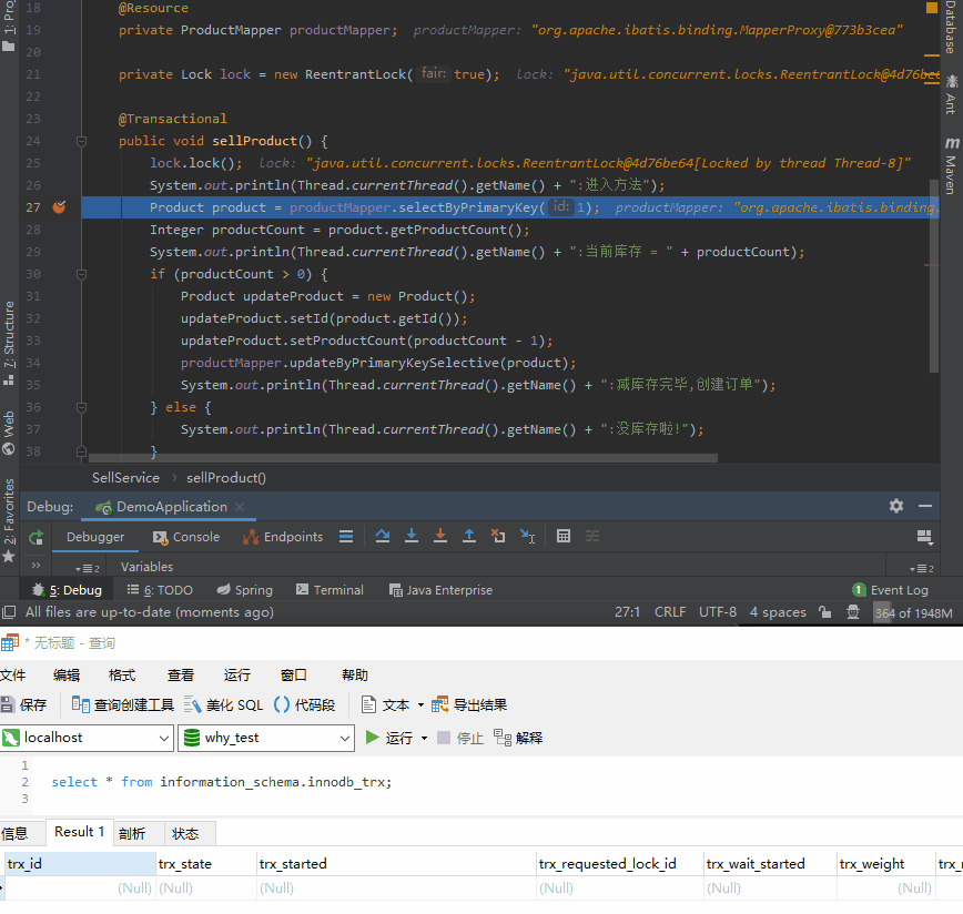 你就注意看下面的动图,是不是第 27 行查询语句执行完成之后,查询事务的语句才能查出数据,说明事务这才真正的开启: