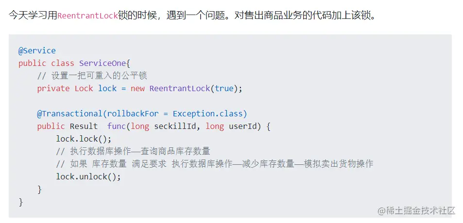 所以你记住了,以后面试官问你 @Transactional 的时候,你把标准答案先背一遍之后,如果你对锁这块的知识点非常的熟悉,就可以在不经意间说一下结合锁用的时候的异常场景。