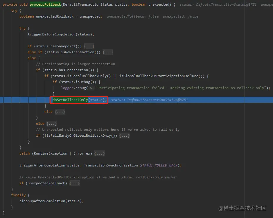 问题就精简为了:defStatus.isGlobalRollbackOnly() 为什么是true?