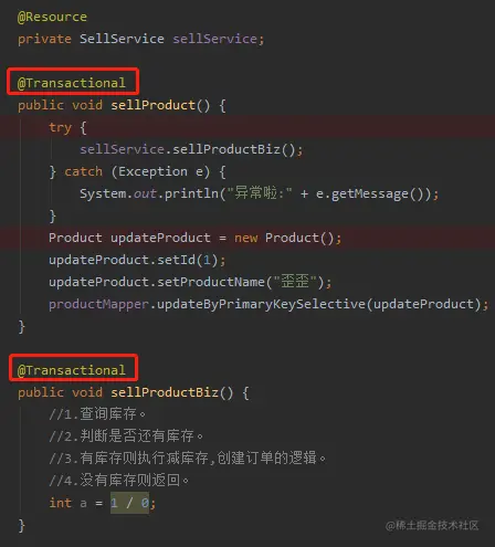 这里有 sellProduct、sellProductBiz 两个事务,sellProductBiz 是内层事务,它会抛出了异常。