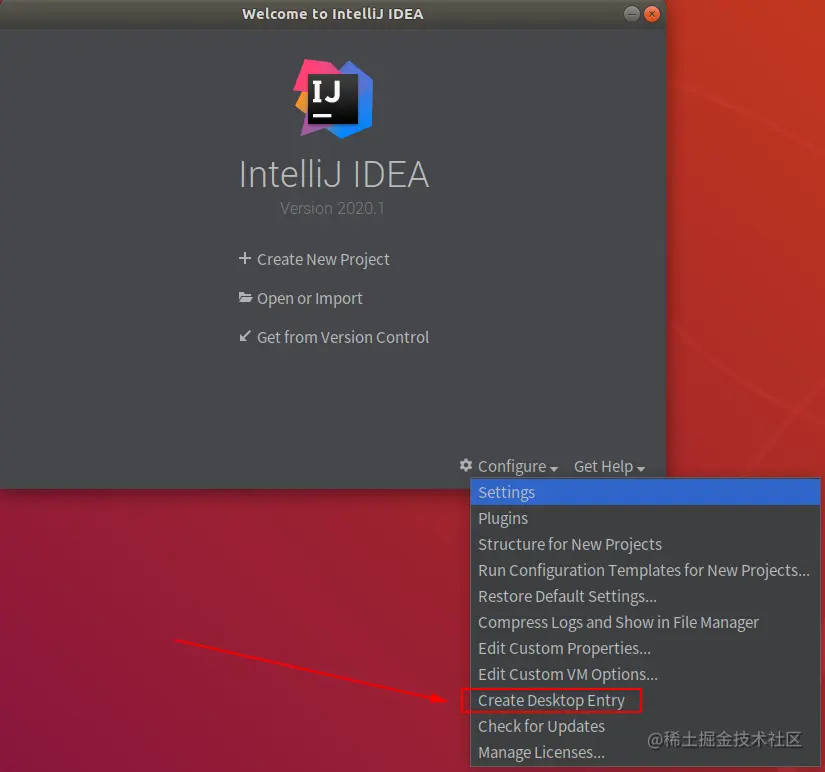 打开 IDEA 后,进入 Configure -> Create Desktop Entry,然后输入 root 用户密码即可;