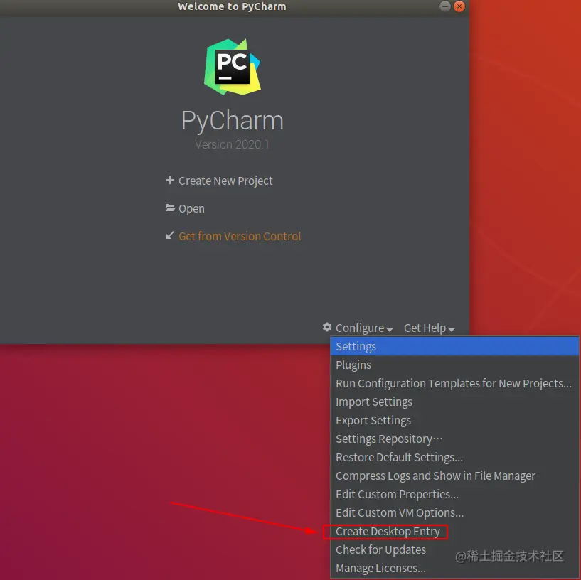 打开 Pycharm 后,进入 Configure -> Create Desktop Entry,然后输入 root 用户密码即可;