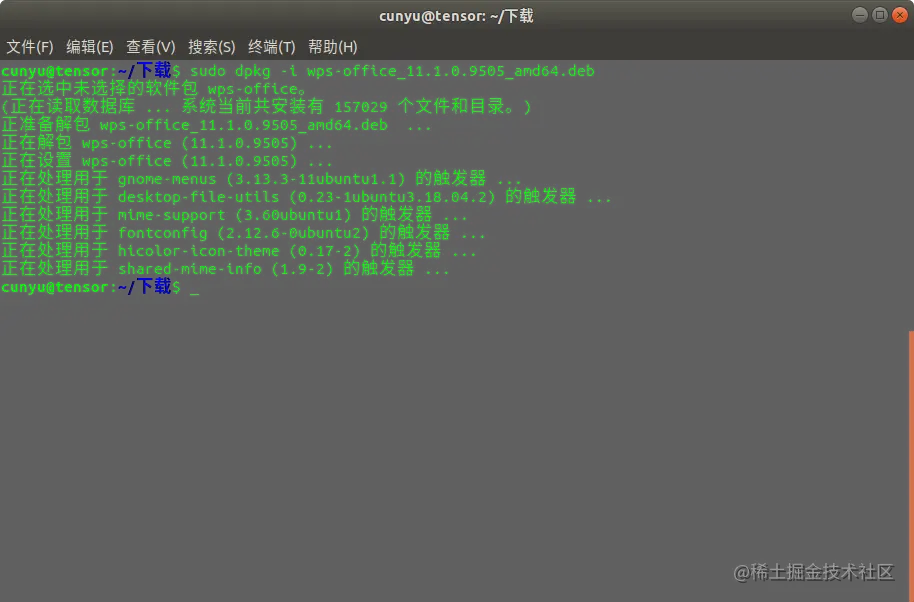 sudo dpkg -i wps-office_11.1.0.9505_amd64.deb