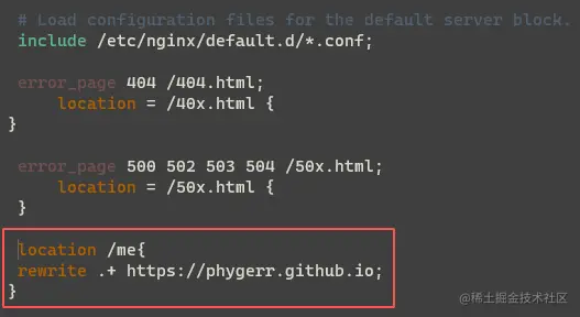 目标:当访问https://{server_ip}/me时,自动跳转到:https://phygerr.github.io。