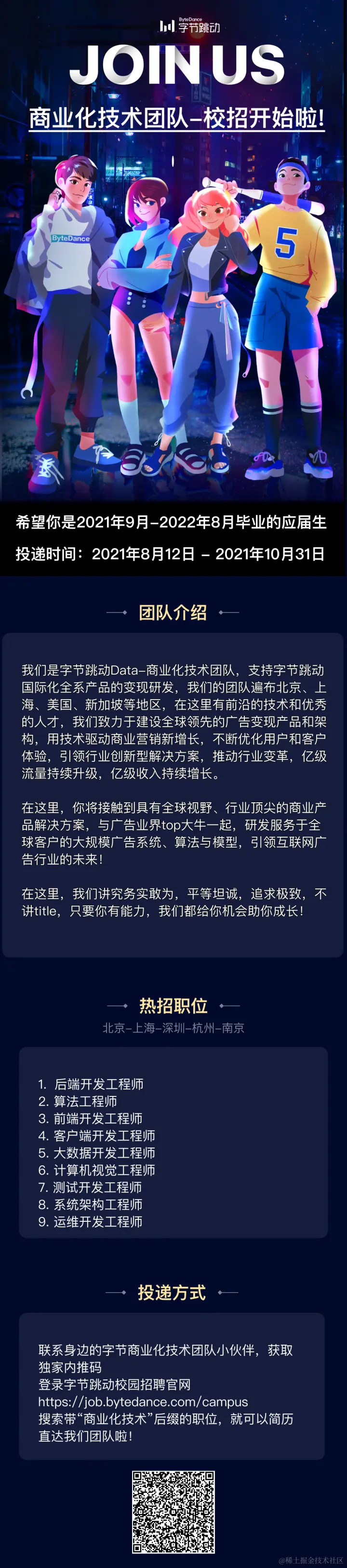 2022 字节跳动 ByteDance 秋招校招内推我的内推码:2NYX4JX seeyouagain25430 2021-08-23 174 阅读1分钟 2022 字节跳动 ByteDance 秋招校招内推 各位学长学姐/师弟师妹们~看过来~ 字节跳动22年校招正式启动啦,内推简历直达广告技术部门(最最最最最核心),优先筛选!!! 对于岗位有疑惑的同学,不要犹豫,留言或者私信,随时沟通!!! 字节跳动校招内推码: 2NYX4JX 投递链接: 加入字节跳动 后端开发工程师-商业化技术 投递链接: 加入字节跳动 算法工程师-商业化技术 投递链接: 加入字节跳动