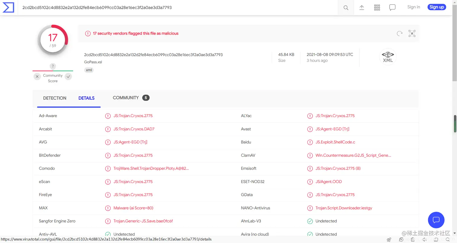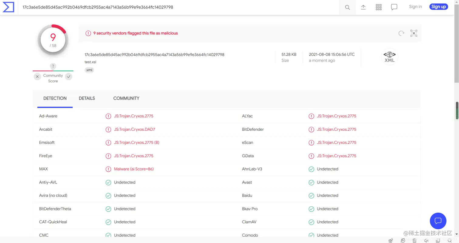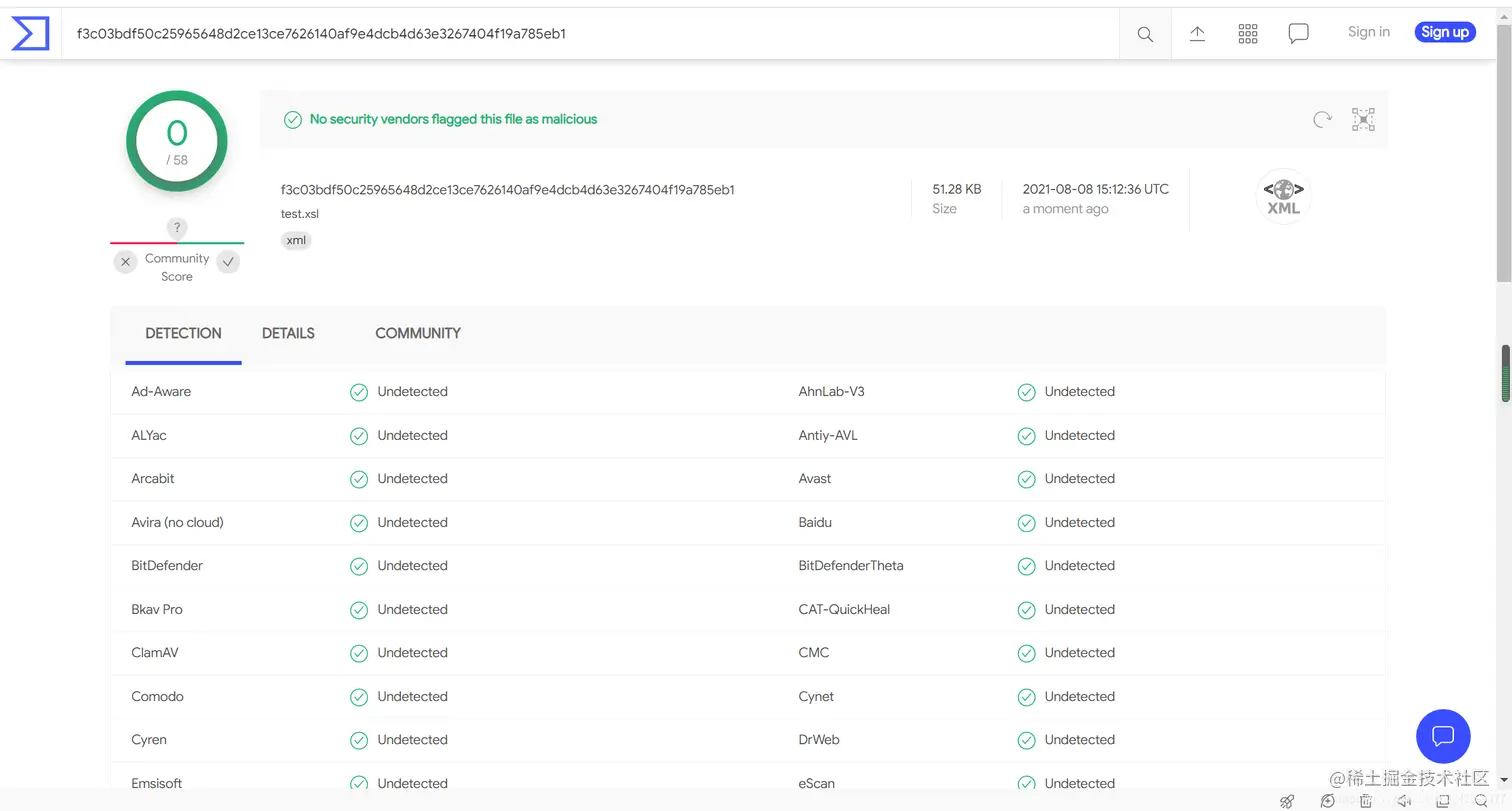 此处只讨论静态免杀,在 vt 上效果如下。