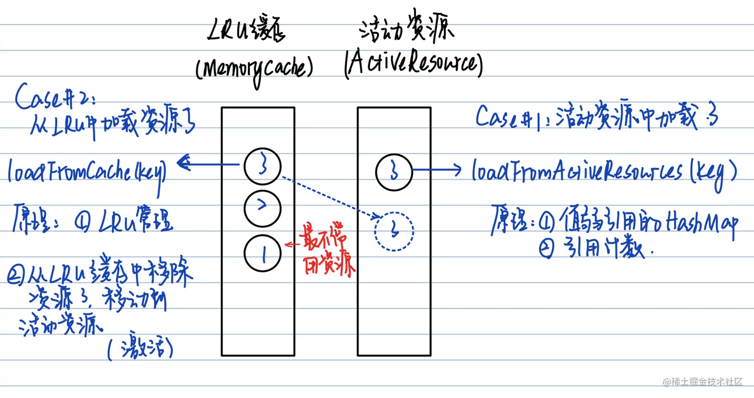 Case#1: 如果活动资源中直接有需要的Key对应的资源,直接从活动资源里面拿 Case#2:如果活动资源中没有,从Cache中拿,并且将这个资源获取之后“激活”,放入活动资源。