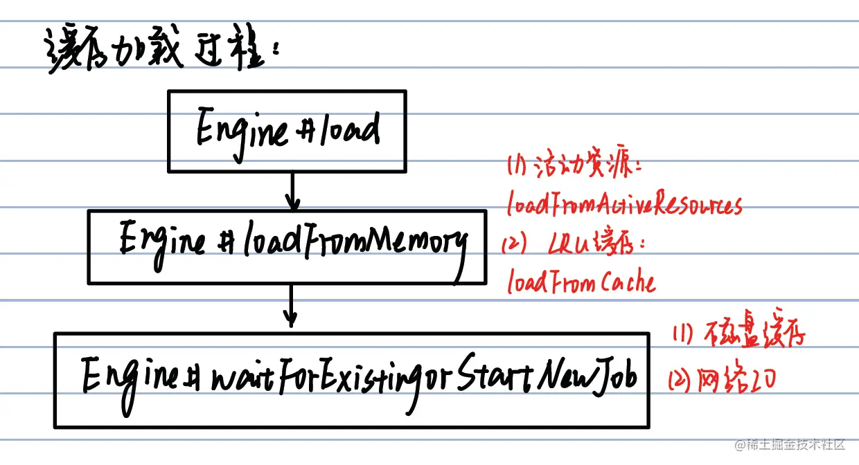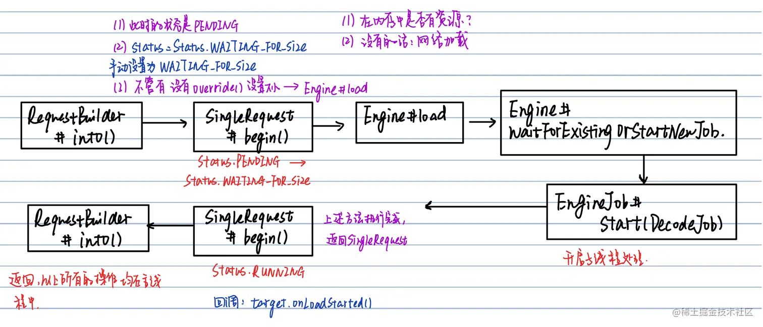 请求的入口是RequestBuilder#into,通过Request#begin开始请求。在Request中会首先标记标记当前的请求状态为PENDING,也就是构建好了请求,但是还未开始。然后再进入Engine#load,在Engine#load中会判断是要加载内存中的(活动资源 Cache资源)资源,还是加载磁盘中,亦或是开启新任务。准备好了之后就会开启子线程处理这个任务,并且回到begin。当前请求状态是RUNNING。然后就等让Target等待结果,在这个过程中可以设置ImageView的;placeholder。