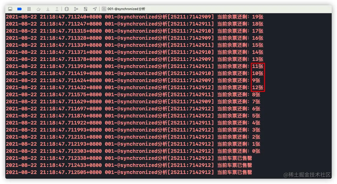 通过打印结果我们发现,余票数量发生了混乱,这样就会造成数据不安全的问题。那么如何解决这个问题呢?我们可以通过加锁的方式来保证同一时刻只有一个线程在访问对象,这样就能够保证数据的安全性,那么余票数量也能够正确显示了;