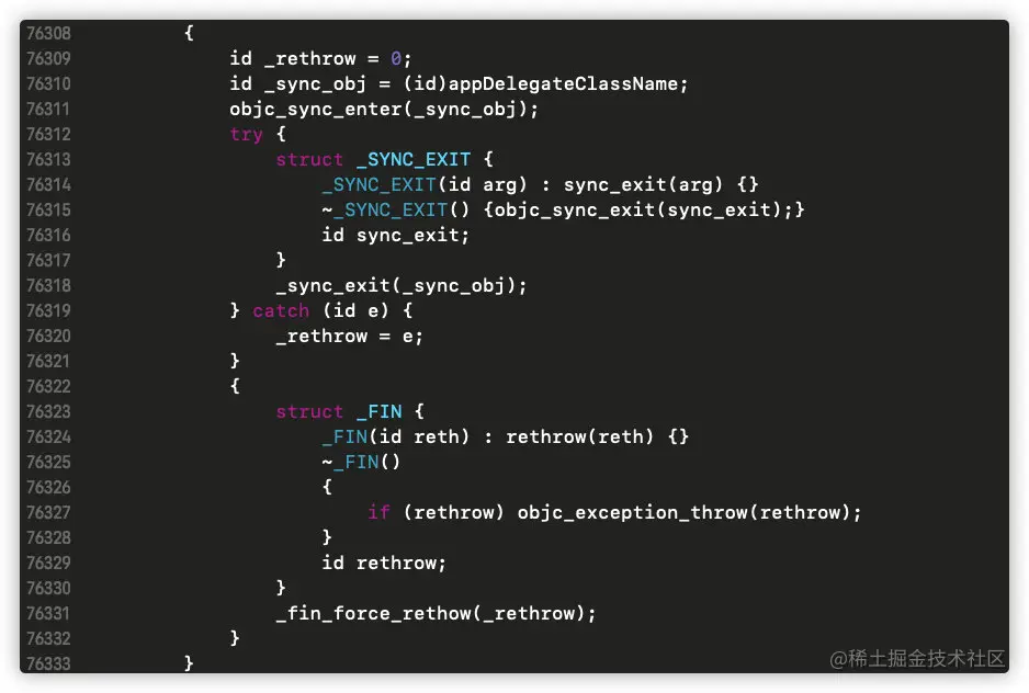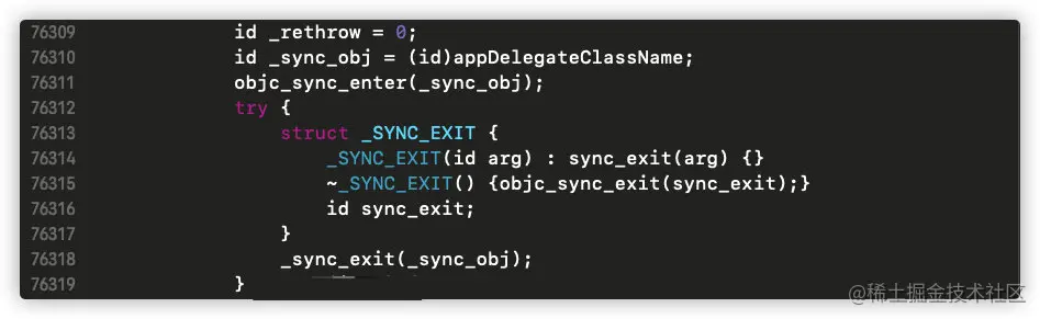 然后_SYNC_EXIT结构体是一个结构体,可以领出去;_sync_obj是appDelegateClassName也不用研究,那么最后就只剩下代码: