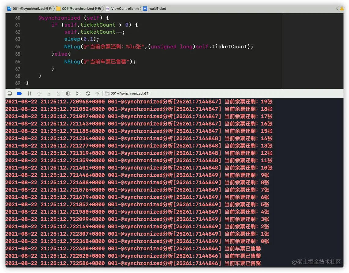 我们使用@synchronized来对售票操作进行加锁,代码修改查看运行结果: