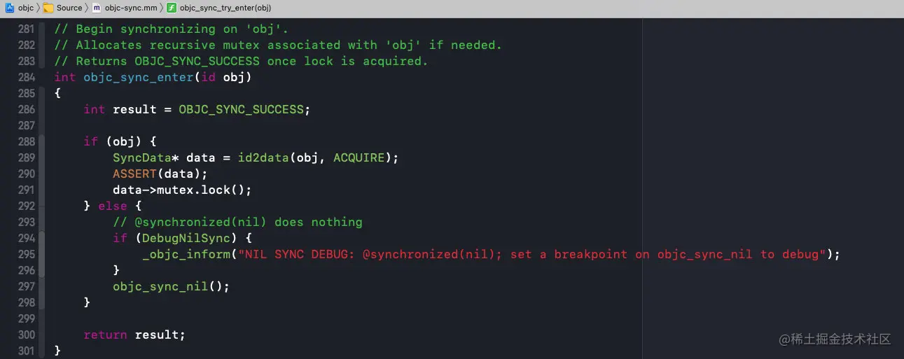 objc_sync_enter中obj存在时生成一个SyncData类型的数据:SyncData* data = id2data(obj, ACQUIRE);并且调用了data->mutex.lock();方法进行加锁;objc_sync_enter中obj存在时也生成了一个SyncData类型的数据:SyncData* data = id2data(obj, RELEASE);,如果这个数据data存在则调用了data->mutex.tryUnlock();方法进行解锁;