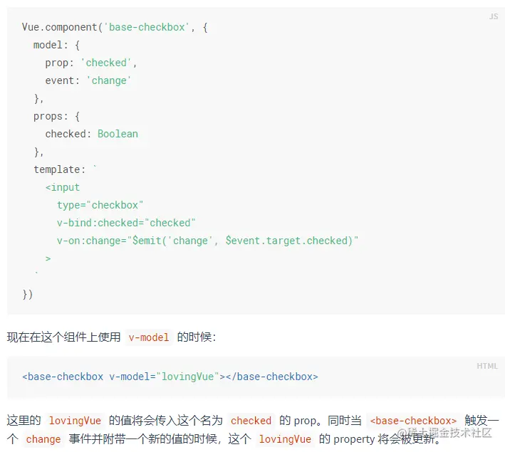 但是像单选框、复选框等类型的输入控件可能会将 value attribute 用于不同的目的。model 选项可以用来避免这样的冲突: