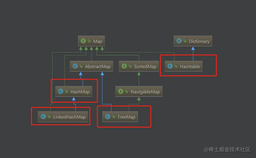 java中Map数据结构定义了一个主要的接口:java.util.Map。主要实现这个接口的类是:HashMap、HashTable、LinkedHashMap、TreeMap。关系如下