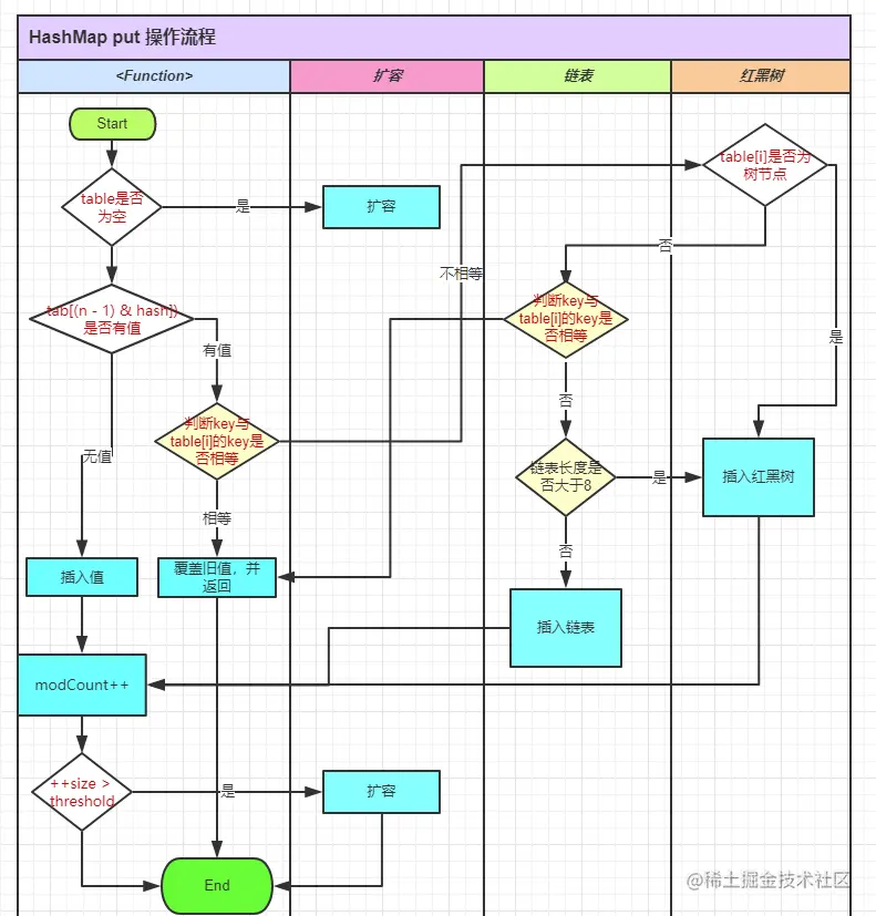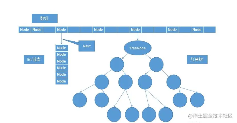 HashMap在1.7中只用到了数组和链表,代码也只有一千多行。上图展示的是1.8的存储结构,在1.8中加入了红黑树,在链表大于8的时候转换为红黑树;扩容后导致红黑树节点在小于6时,又会转换成链表。代码量虽然翻倍了,带来的确实性能的提升。