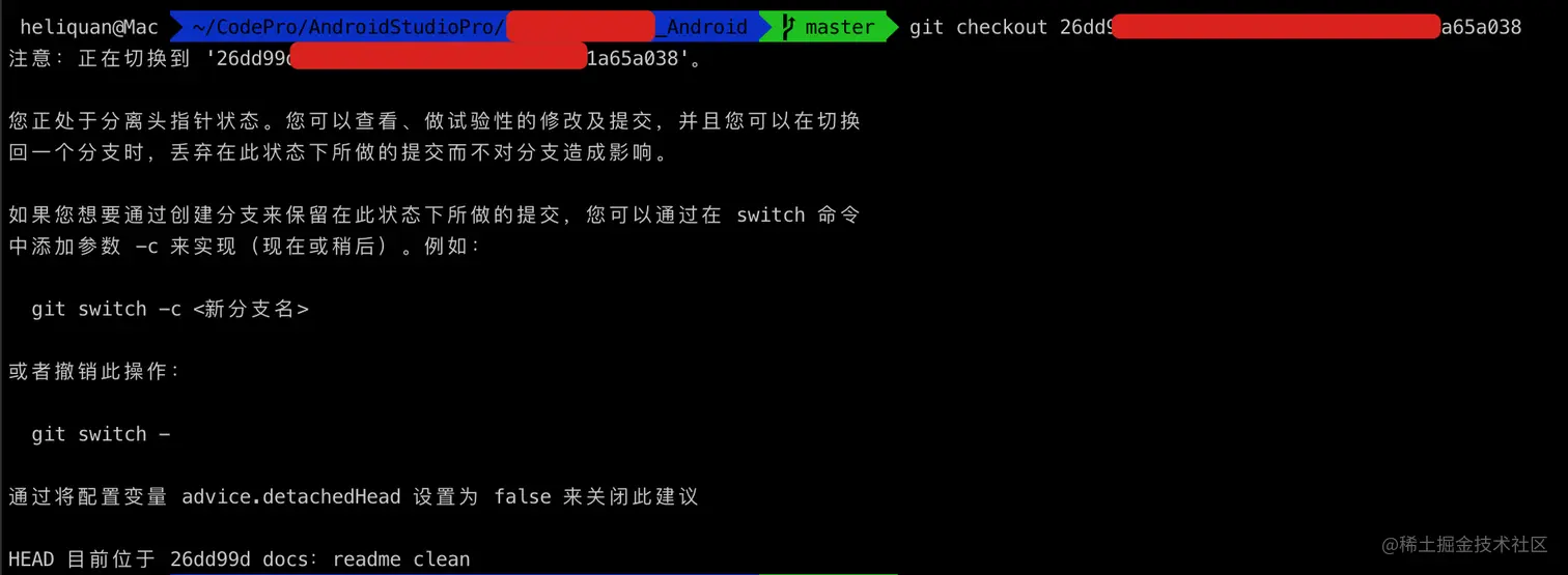 首先复制右下角当前 commit 到 hash 值,随后切换到 master 分支,执行如下命令:
