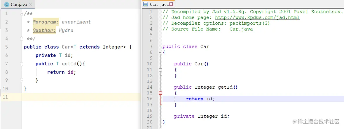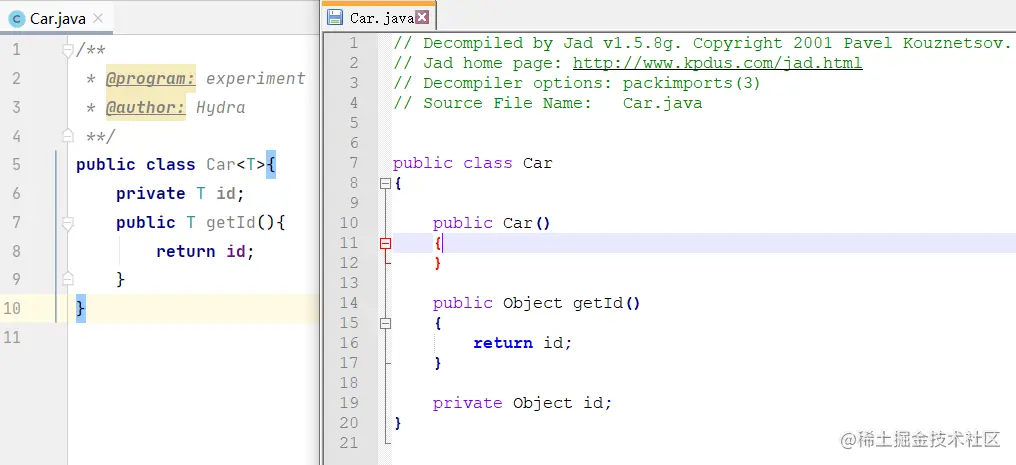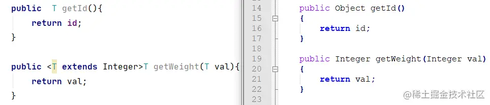 当类定义中的类型参数没有任何限制时,在类型擦除后,会被直接替换为Object。在下面的例子中,<T>中的类型参数T就全被替换为了Object(左侧为编译前的代码,右侧为通过字节码文件反编译得到的代码):