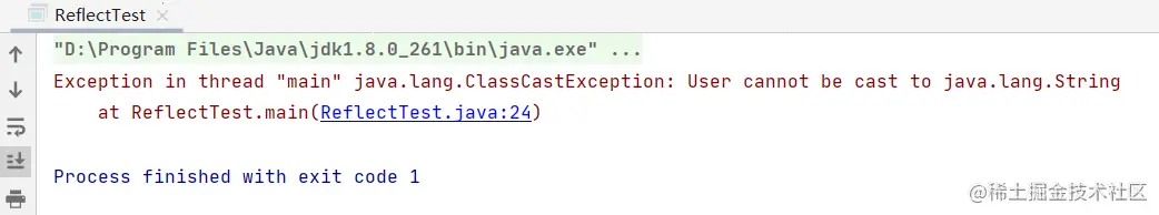 可以看到虽然数组中声明的泛型类型是String,但是仍然成功的放入了User类型的对象。那么,如果我们在代码中尝试取出这个User对象,程序还能正常执行吗,我们在上面代码的最后再加上一句: