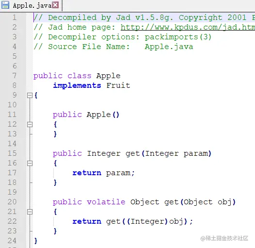 但是,如果真是这样的话那么代码是无法运行的,因为虽然Apple类中也有一个get方法,但是与接口中的方法参数不一致,也就是说没有覆盖接口中的方法。针对这种情况,编译器会通过添加一个桥接方法来满足语法上的要求,同时保证了基于泛型的多态能够有效。我们反编译上面代码生成的字节码文件: