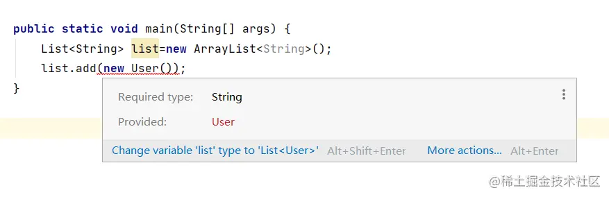 可以看到,在取出元素时,会将这个元素强制类型转换成泛型中的类型,也就是说在上面的代码中,最后会尝试强制把User对象转换成String类型,在这一阶段程序会报错。通过这一过程,也再次证明了泛型可以对类型安全进行检测。