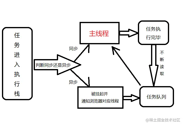 所有的任务都可以分为同步和异步任务,同步任务,顾名思义就是立即执行的任务,同步任务一般会直接进入到主线程执行,而异步任务,比如ajax网络请求,定时器函数都属于异步任务,会通过任务队列的机制(先进先出的原则)来进行协调。用图来表示就是: