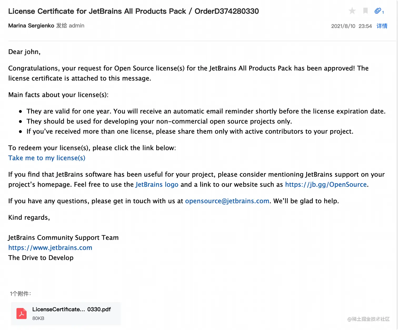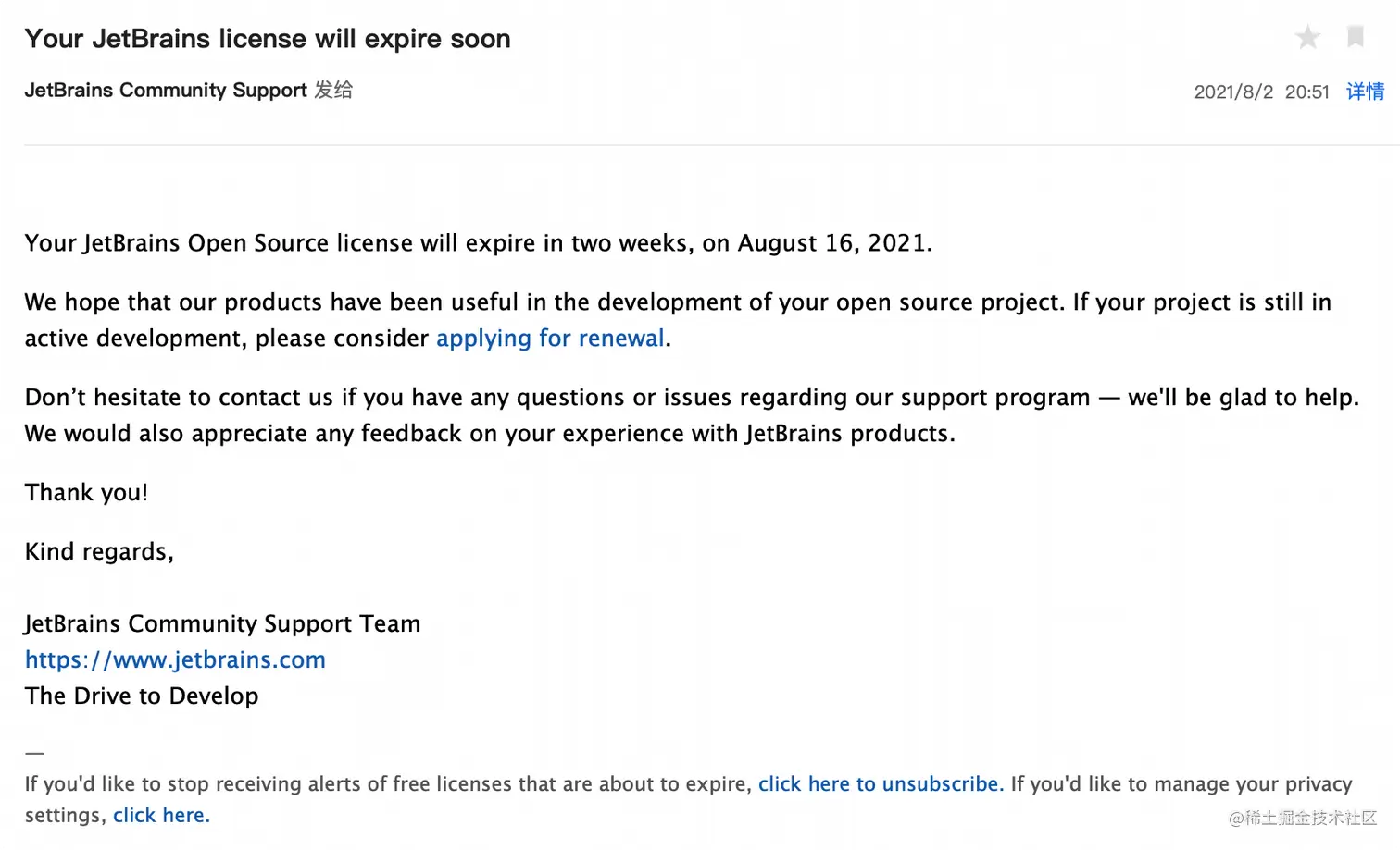 这次算是续期,激活码过期前 2 周会收到一封过期提醒邮件,从提续期申请到确认激活仅用了 2 天,感谢 JetBrains...