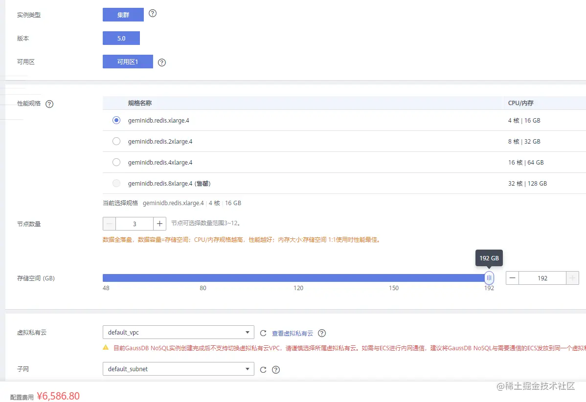 原生Redis的数据存放在内存中,高斯 Redis的数据存放在磁盘中,我们比较相同数据容量(192G)的成本开销。