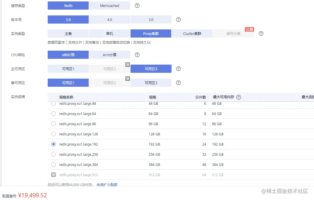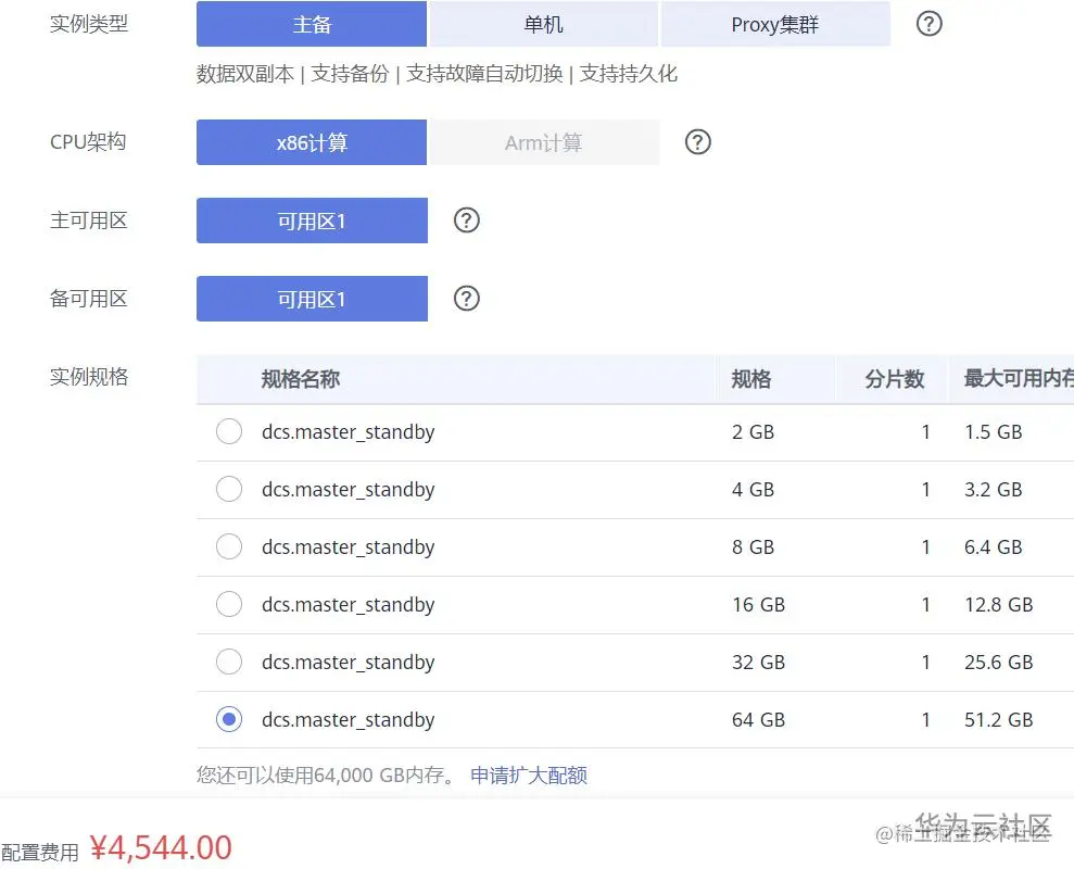 因为高斯 Redis最小实例的容量是48G,因此购买对标的原生Redis实例,为64G主从规格(实际可用内存“号称51.2G”)。