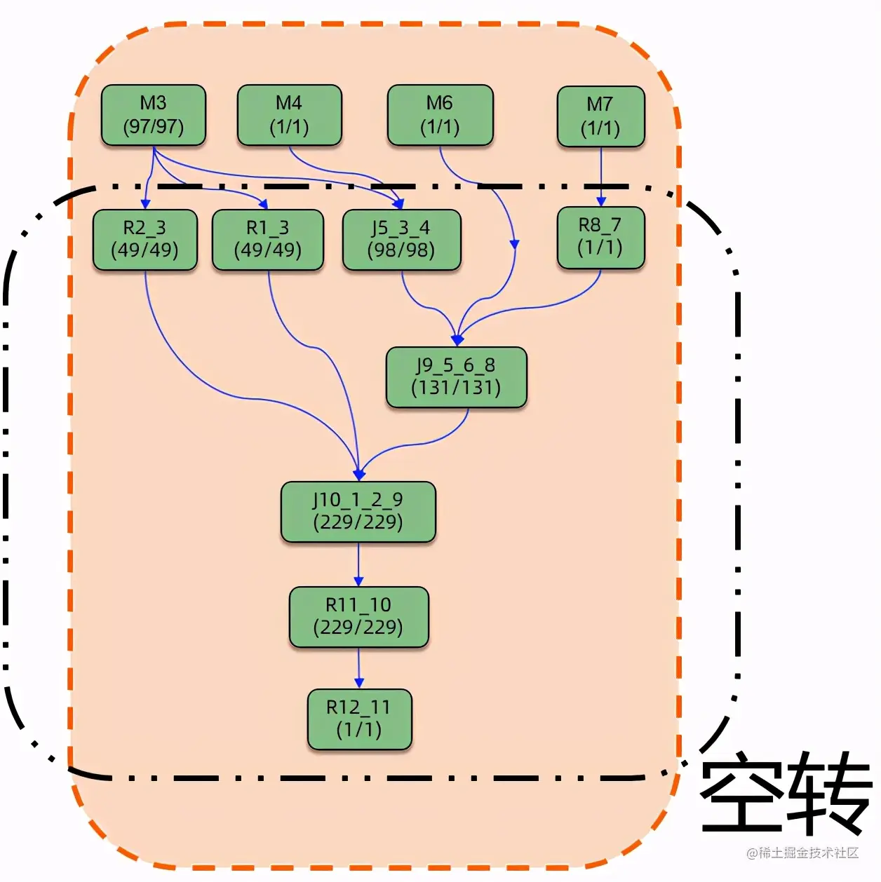 这个观察结论其实并不意外,或者从某种程度上是by design的。拿下图一个典型SQL产生的DAG来看,所有计算节点都在作业提交伊始就被拉起,虽然这样的调度方式允许数据得以(在需要的时候)pipeline起来,从而可能加速数据的处理。但并不是所有的执行计划里的所有上下游计算节点都可以有理想化的pipelined dataflow。事实上对于许多作业而言,除了DAG的根节点(下图中的M节点)以外,下游的计算节点在某种程度上都存在着一定程度的浪费。