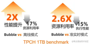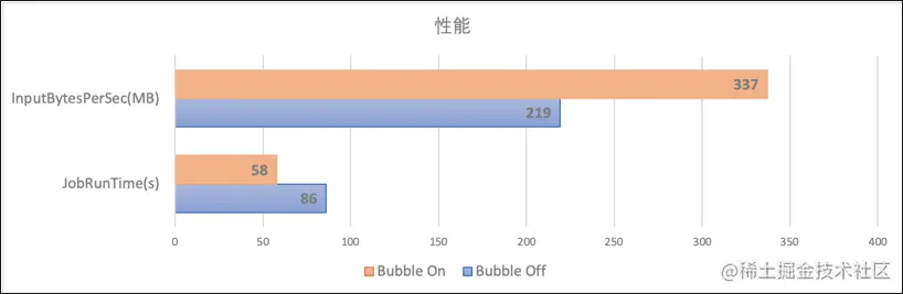我们针对signature相同的query在bubble execution关闭和打开时进行对比,我们发现在整体的资源消耗基本不变的基础上,作业的执行性能提升了34%,每秒处理的数据量提升了54%。