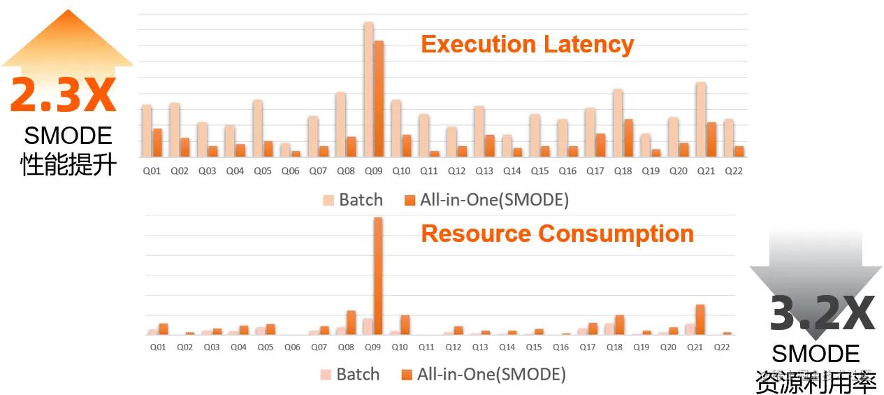 从上图可以看到,离线作业和一体化调度的准实时作业,在调度方式,数据传输,使用资源来源等多个方面,都有非常显著的区别。可以说,这两种运行方式分别代表了在海量数据场景上按需申请资源来优化吞吐量和资源利用率,以及在处理中等(少量)数据时通过计算节点的全量预拉起来(以及数据直传等手段加速)降低执行时延的两个极端。而这些区别,最终会通过执行时间和作业资源利用率等方面体现出来。很显然,以高Throughput为主要优化目标的离线模式,和以追求低Latency的准实时模式,在各方面的性能指标会有很大的区别。比如以1TB-TPCH标准benchmark为例,此报告执行时间(性能)和资源消耗两个维度来做比较。可以看到,准实时的(SMODE)在性能上有着非常明显的优势(2.3X),但是这样的性能提升也并不是没有代价的。在TPCH这个特定的场景上,一体化执行的SMODE模式,在获取了2.3X性能提升的同时,也消耗了3.2X的系统资源(cpu * time)。