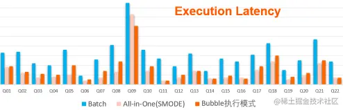 - 在执行时间层面,对于TPCH测试集中的任意query,bubble模式的执行时间都比batch模式要短,整体上22个Queries总耗时缩减将近2X,接近service mode模式的耗时;