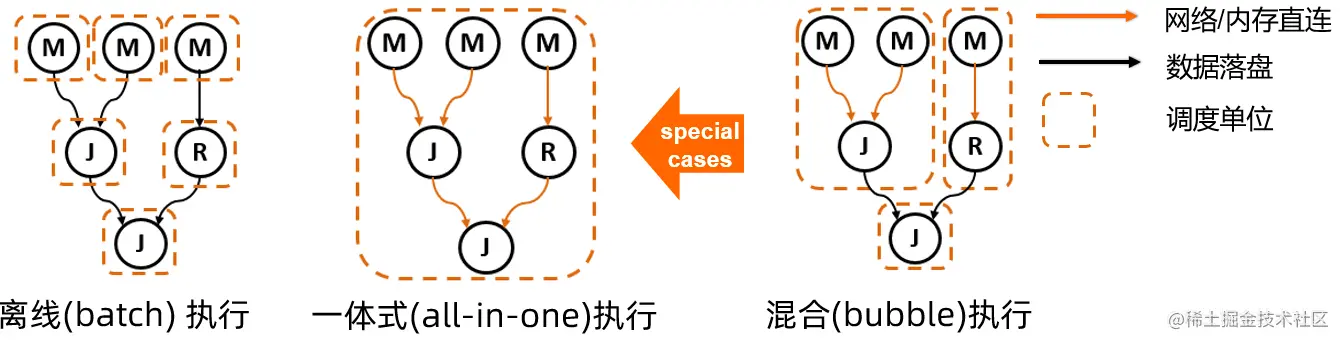 DAG框架的核心架构思想,在于对执行计划的逻辑层与物理层的清晰分层设计。物理执行图是通过对逻辑图中的节点、边等的物理特性(如数据传输介质,调度时机,资源特性等)的物化来实现的。对比在Fig.2中描述的batch模式和smode模式,DAG提供了在一套灵活的调度执行框架之上,统一离线模式和准实时一体化执行模式的实现。如同下图所示,通过调整计算节点和数据连接边的不同物理特性,不仅能对现有的两种计算模式做清晰的表述,在对其进行更通用化的扩展后,还可以探索一种全新的混合运行模式,也就是Bubble Execution。