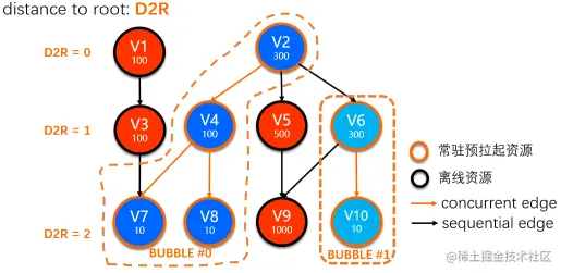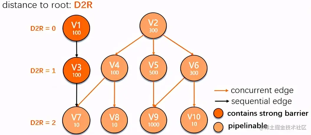 - Bubble边界上存在mixed-inputs的bubble root vertex(比如 Fig.9中的V7)。这种情况需要一些特殊处理,虽然V7与V4是通过concurrent edge链接,但是由于V7的调度同时被V3通过sequential edge控制,所以事实上需要等待V3完成min-fraction后才能调度V7。对于这种场景,可以将V3的min-fraction配置为较小(甚至0)来提前触发;此外Bubble内部我们也提供了progressive调度的能力,对这种场景也会有帮助。