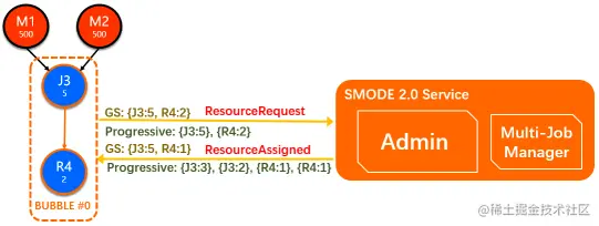 在Bubble被触发调度后,会直接向SMODE Admin申请资源,默认使用的是一体化Gang-Scheduling(GS)的资源申请模式,在这种模式下,整个Bubble会构建一个request,发送给Admin。当Admin有足够的资源来满足这个申请时,会将,再包含预拉起worker信息的调度结果发送给bubble作业的AM。