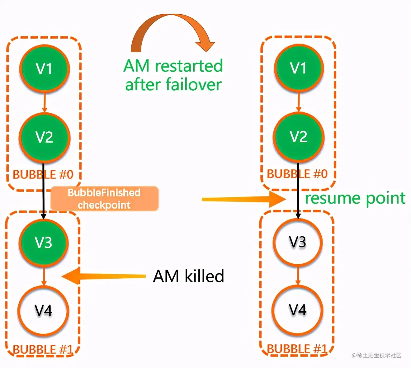 比如在下图这个例子中,DAG中包含两个Bubble(Bubble#0: {V1, V2}, Bubble#1: {V3, V4}),在发生AM重启时,Bubble#0已经TERMINATED,并且写出BubbleFinishedEvent。而Bubble#1中的V3也已经Terminated,但是V4处于Running状态,整个Bubble #1并没有到达终态。AM recover之后,V1,V2会恢复为Terminated状态,而Bubble#1会重头开始执行。