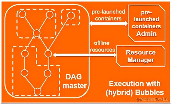 为了实现计算的加速,Bubble内部的计算节点的来源默认均来自常驻的预热资源池,这一点与准实时执行框架相同。与此同时我们提供了灵活的可插拔性,在必要的情况下,允许Bubble计算节点从Resource Manager当场申请(可通过配置切换)。